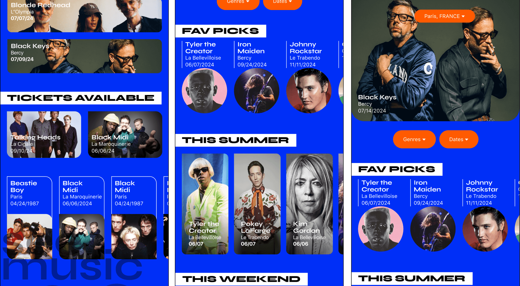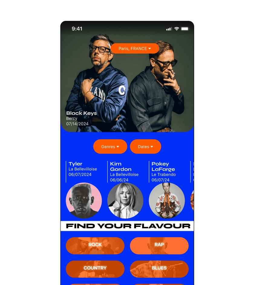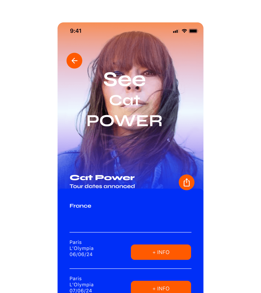 Bandsintown is a concert discovery app that integrates data from users' music streaming accounts to create personalized lists of tracked artists for local concert recommendations. It gathers tour dates from over 200 ticket providers, booking agencies, and directly from artists. The idea was to generate new customers, more engagement and returning customers, gaining the trust and confidence of this app. This is an interface redesign, I didn't restructure the information. I changed the grid for a little more space to clarify the grouped information using proximity and distance for visual cues that help identify what information belongs together. The subject is about music, I chose a vibrant approach for the graphic solution, a variety of new card designs. The interface design should facilitate an easy experience for search, personalisation and purchasing of tickets. Taking inspiration from music fanzines and concert posters.