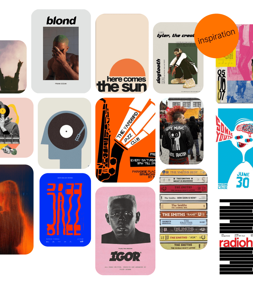 Above you will find the moodboard, lots of feeling, and play, with references to album cover art and posters, there is feedom of expression. Taking inspiration from music, regressive and sometimes rebellious.
