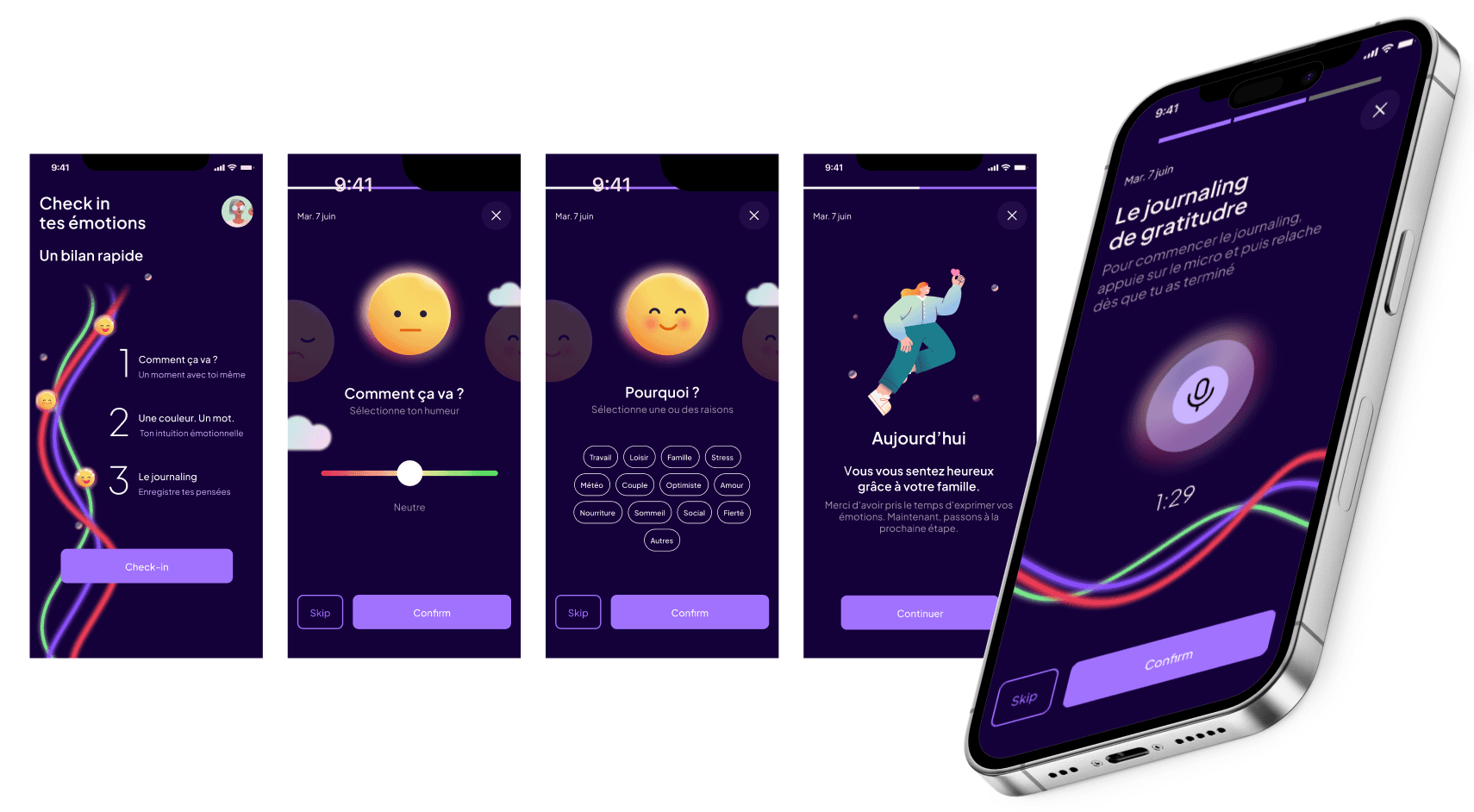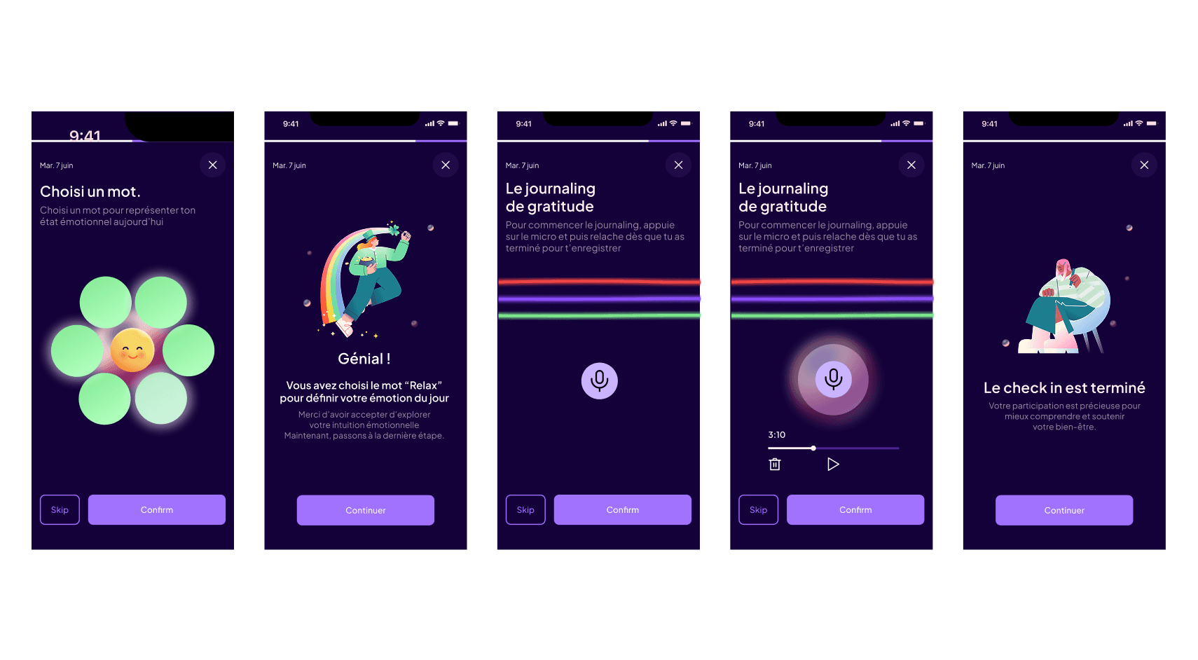 The interface was conceived to be simple by requesting quick and easy tasks, to gamify the engagement by giving rewards and encouragement when used. Micro-interactions were another way bring satisfaction and to help the user understand the functionality of the application. We found illustrations to be a good way to make it friendly, the color choices are those that communicate, wellbeing, security, intimacy and confidence.